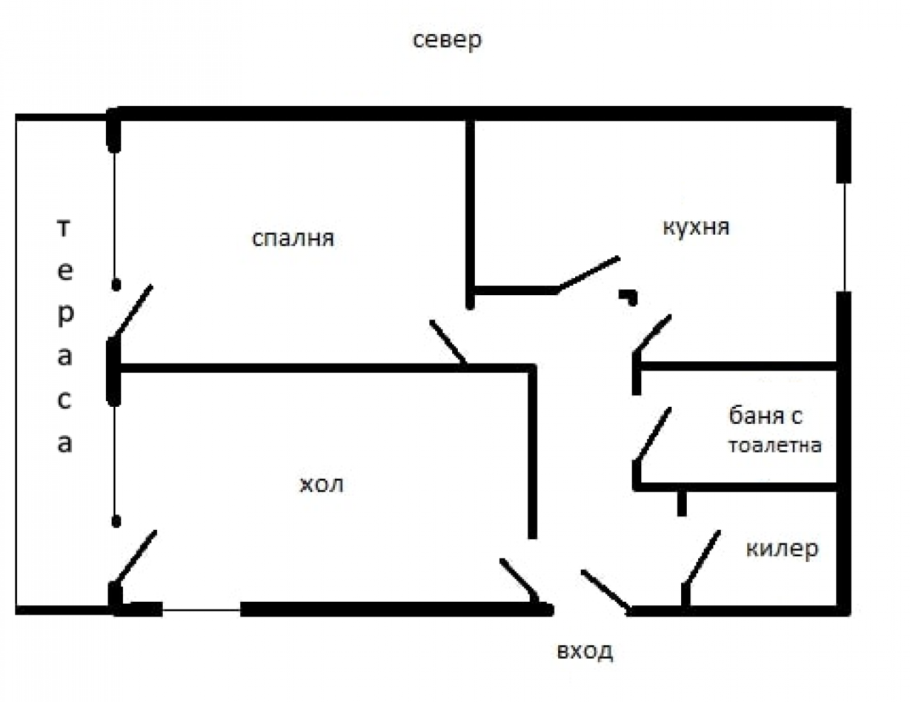Разпределение: спалня, хол, кухня, баня-тоалетна, килер, коридор и тераса. Изложение: запад/изток.