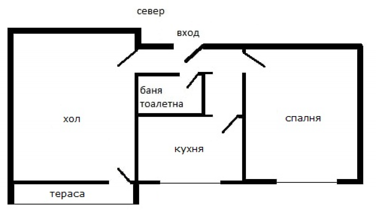 Разпределение: спалня, хол, кухня, баня-тоалетна, коридор и тераса. Изложение: Юг.
